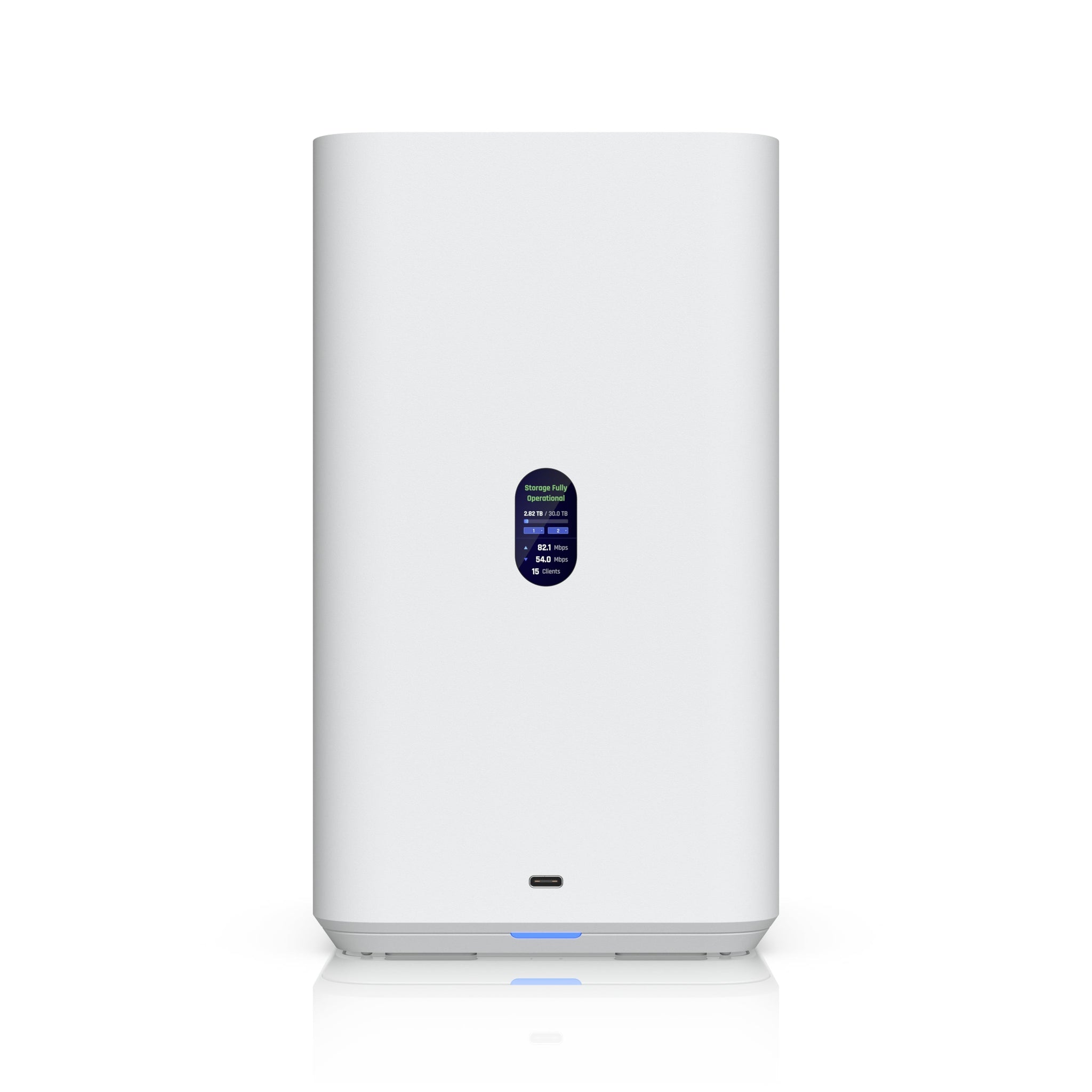 UniFi Network Attached Storage with (2) 3.5' HDD bays, 2.5 GbE networking, USB-C connectivity, and an included PoE++ adapter, all in a compact footprint.